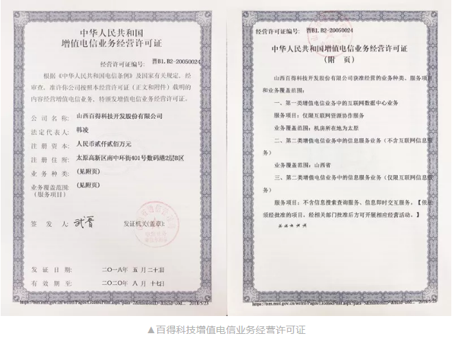 近日,百得科技順利通過(guò)國家工信部的資質(zhì)審核及驗收,成功獲得增值電信業(yè)務(wù)(即IDC)經(jīng)營(yíng)許可證。這一資質(zhì)的審核通過(guò)意味著(zhù)百得科技成為山西地區屈指可數的IDC服務(wù)商。